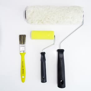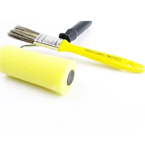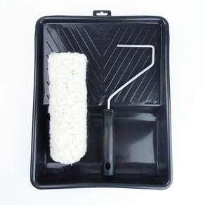 Kit com 1 bandeja Grande, 1 rolo de lã sintética, 23 cm ambos acompanham suporte de aço com cabo e buchas plástica, 1 Rolo de espuma pop 9cm de espuma poliéter, 01 trincha cerda gris 1 com cabo plástico amarelo e virola de aço.