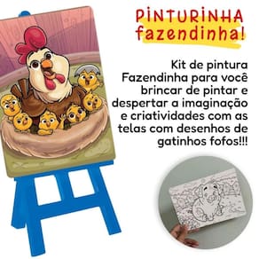 O kit acompanha tudo para transformar qualquer cantinho em um verdadeiro ateliê: 1 Cavalete de Plástico - leve, prático e ideal para os pequenos artistas trabalharem como profissionais 4 Telas em MDF - com desenhos temáticos da fazenda + 1 tela branca para criar seu próprio bichinho do zero Tintas coloridas - cores vibrantes e seguras para soltar a criatividade Diversão e aprendizado garantidos - estimula coordenação motora, criatividade e concentração