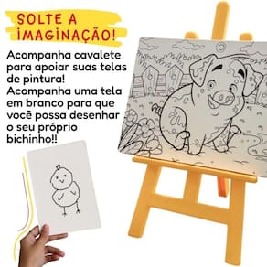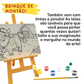 O kit acompanha tudo para transformar qualquer cantinho em um verdadeiro ateliê: 1 Cavalete de Plástico - leve, prático e ideal para os pequenos artistas trabalharem como profissionais 4 Telas em MDF - com desenhos temáticos da fazenda + 1 tela branca para criar seu próprio bichinho do zero Tintas coloridas - cores vibrantes e seguras para soltar a criatividade Diversão e aprendizado garantidos - estimula coordenação motora, criatividade e concentração