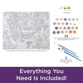 - Inclui tudo o que você precisa: vem completo com 24 latas de tinta, 3 pincéis de tinta de nylon de alta qualidade, tela pré-esticada de 40 x 50 cm em uma moldura de madeira.