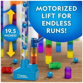 Aproveite a emoção de uma corrida infinita com este kit de pista de mármore que apresenta um elevador motorizado capaz de transportar seus mármores até 40,64 cm de altura e soltá-los na pista! Crie uma máquina de movimento perpétuo que leva continuamente seus mármores de volta ao topo para serem lançados novamente! Com 106 peças de construção, 30 mármores e o elevador espiral de 14 peças, você tem tudo que precisa para criar infinitas configurações de pistas de mármore! Uma bolsa de armazenamento também está incluída para guardar com segurança seu kit. Expanda qualquer Pista de Mármore Brilho no Escuro da National Geographic com este kit! Todas as peças, incluindo o elevador espiral, funcionam perfeitamente com conjuntos existentes não magnéticos, para que você possa criar pistas ainda maiores! Com os brinquedos STEM da National Geographic, a aprendizagem é sempre parte da diversão! O Guia de Aprendizagem incluído contém fatos fascinantes sobre física, movimento e muito mais! Também oferece dicas para construir incríveis pistas de mármore! O Blue Marble, vencedor do prestigioso prêmio Toy of the Year Award da Toy Association, desenvolve com orgulho produtos que promovem educação, imaginação e criatividade.