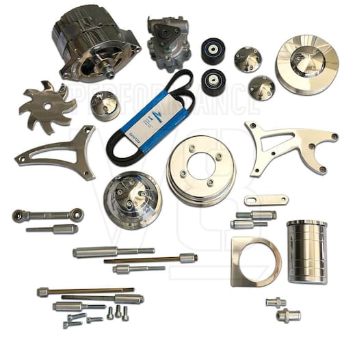 Kit de polias billet para motores v8 ford 302 Composição do kit: 4 polias 1 suporte alternador 1 suporte de direção 2 roldanas 1 esticador olhal 1 correia 1 kit parafusos 1 bomba de direção 95 bar 1 alternador cromado 90 a 1 reservatório de direção Acabamento polido; Acompanha parafusos, calços e espaçadores; Manual de instalação com informações; Alto padrão de acabamento. Recomendamos que a instalação seja realizada por um profissional qualificado. Garantia: 3 meses Marca: PerformanceV8