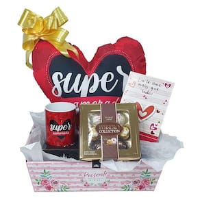 PRESENTE DE AMOR - PARA DIA DOS NAMORADOS - KIT DE CESTA COM ALMOFADA, CANECA E CARTÃO + CHOCOLATE FERRERO ROCHER