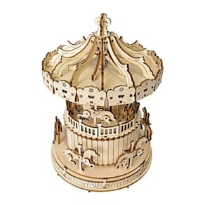 Material: madeira Tamanho: 15x15x23 cm Peso: 638 g Tema Charming Carousel — Apresenta um carrossel giratório com cavalos de design complexo e detalhes em forma de coração, evocando a alegria nostálgica do parque de diversões. Kit prático de quebra-cabeça DIY — Inclui peças de madeira cortadas com precisão para os usuários construírem à mão, oferecendo uma experiência artesanal agradável e de desenvolvimento de habilidades. Função de manivela mecânica — gire a manivela para ativar a música e o movimento — sem necessidade de baterias. Os cavalos giram suavemente em sincronia com a melodia. Resistente e decorativa — Feita de madeira durável, esta caixa de música de 15x15x23cm é uma peça de exibição deliciosa para quartos, estantes de livros ou mesas de estudo. Perfeito para presentear e aprender — Um presente criativo e envolvente para crianças, adolescentes ou adultos que gostam de quebra-cabeças, música e arte decorativa feita à mão.