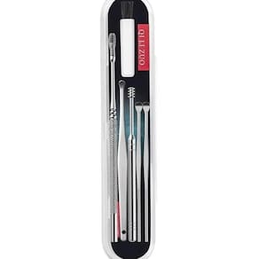 O pacote incluir: 5 curetas com tamanhos e formatos diferentes, uma escova de cerdas duras para se efetuar a limpeza dos utensílios. Esteriliza-los após o uso.
