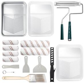 Este kit de rolo de pintura de 23 cm inclui tampas de rolo de pintura de 10 cm e 23 cm, bandeja de tinta com forros, pincel de pintura angular, folhas de plástico, raspador de tinta de plástico, abridor de latas e haste de agitação. O kit de rolo de pintura de 18 peças oferece todas as ferramentas que você precisa para melhorar sua casa, economizando tempo e aumentando sua produtividade. O rolo de 23 cm pode suavizar grandes áreas da parede, e o rolo de 10 cm e o pincel de 5 cm ajudam você a completar alguns cantos e detalhes. Também fornecemos uma folha de plástico para ajudá-lo a esconder os móveis da tinta, abridor de latas e bastão de agitação para ajudá-lo a abrir facilmente a lata de tinta e mexer a tinta para uniformizar a tinta. A bandeja rígida e os dois forros podem ser divididos em diferentes cores de tinta, melhorando a eficiência da pintura. - Conjunto de rolos de pintura de 18 peças: o conjunto inclui capas de rolo de pintura de 23 cm, capas de rolo de pintura de 10 cm, bandeja e forros de tinta de 23 cm, moldura de rolo de pintura de 10 cm e 23 cm, pincel de pintura angular de 5 cm, raspador de tinta de plástico de 4 cm, abridor de latas e haste de agitação - Capas de rolo de tinta de microfibra: as tampas de rolo de 22,8 cm podem suavizar grandes áreas da parede, e o rolo de 10 cm ajuda você a completar algumas pequenas áreas e detalhes dos móveis. As mangas de rolo são laváveis e reutilizáveis, o suficiente para completar um projeto de pintura grande ou pequeno - Bandeja de tinta e folhas de plástico: A bandeja de tinta dura com 2 forros de bandeja de tinta substituíveis são laváveis e reutilizáveis, várias bandejas podem ser divididas em diferentes cores de tinta, conclusão mais conveniente e rápida dos projetos de pintura. Folha de plástico para ajudar você a cobrir os móveis da tinta e poeira - Pincel de pintura e outras ferramentas: O pincel de pintura de pico inclinado de 5 cm pode modificar algumas bordas, aperfeiçoar os cantos que não podem ser escovados pelo pincel de rolo e tornar toda a parede ou superfície do móvel mais plana. Abridor de latas e bastão de agitação para ajudá-lo a abrir facilmente a lata de tinta e misturar a tinta. Diferentes tamanhos de facas de massa de plástico podem ser usadas em diferentes cenários - Economize tempo e dinheiro: basta comprar estes 18 kits de rolos de pintura para fornecer as ferramentas que você precisa para renovar e melhorar a decoração da sua casa, e todos eles são produtos que podem ser limpos e reutilizados
