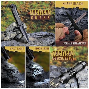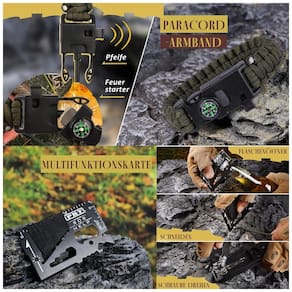 O kit contém lanterna de 3 modos, iniciador Handy Fire, serra de arame, cartão de sabre multifuncional, pulseira Paracord, clipe de garrafa de água, cobertor de emergência. Com mais de 1000 usos combinados, este kit habilmente montado é o kit de sobrevivência mais inteligente e compacto de seu tipo