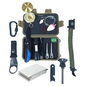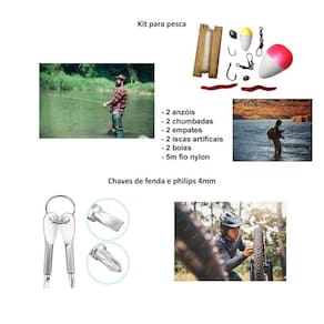 Kit De Sobrevivência Emergência Trilha Pesca Camping Bússola Este kit de sobrevivência é essencial para qualquer campista ou trilheiro, pois pode fazer a diferença em situações de emergência. Aqui estão os itens contidos neste kit: - afiado com 16cm de comprimento - Pederneira com raspador - Lençol térmico - Bússola - Pulseira paracord, com apito, mini-pederneira e mini-faca - Lanterna com carregameto via USB carregar antes do uso - Jogo de chave philips e fenda - kit pesca 2x anzol, chumbada, empate, boia, isca artificial e 5m de fio de nylon - Prendedor de garrafa no cinto - Caixa plástica hermético medindo 17x11x5cm - Patch da bandeira do Brasil 1cm que pode ser fixada em roupa aquecendo com ferro de passar roupa Marca: Não Informado