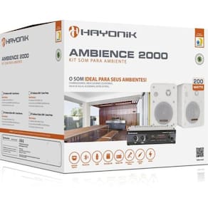 O Kit de Som Para Ambiente Hayonik Ambience 2000 OD V2 proporciona som ideal para todos os ambientes! O Kit para som ambiente AMBIENCE LINE da Hayonik possibilita sonorizar seu ambiente de forma prática e com grande facilidade. Além da incrível qualidade de som, com 200W de potência musical, o kit ainda conta com uma ampla compatibilidade. Reproduz arquivos através da entrada USB, SD/MMC, via Rádio FM e ainda possui Bluetooth para compartilhar suas músicas favoritas diretamente do seu smartphone em diversas áreas como churrasqueiras, áreas gourmet, salões de festas, escritórios, salas de convenção e academias. Conta com o Amplificador Compact 200 que oferece ainda mais vantagem por ser óptico, ou seja, por sua transmissão de áudio ser através da luz, sem um condutor, não sofre nenhuma interferência de rádio ou eletromagnética. Além disso, o Amplificador Compact OD também é vantajoso por contar com fonte chaveada, que apresenta menor peso e tamanho e podem ter eficiência de 70% a 98%. Alimentação:BivoltClasse:A/BCanais:2Potência:Amplificador: 20W RMS / Caixa: 30W RMS (Cada)Impedância:Amplificador: 4 Ohms / Caixa: 8 Ohms (Cada)Entradas:Optical IN (Toslink), Auxiliar (RCA), Microfone (P10), USB, SD/MMC CardSaídas:Até 2 caixasDimensões:Amplificador: 55x210x116mm / Caixa: 140x205x125mm (Cada)Pesquisa:Kit|som ambiente|ambience 2000|ambience 200 od v2|od|compact od|optico|