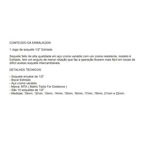 CONTEÚDO DA EMBALAGEM 1 Jogo de soquete 1/2" Estriado Soquete feito de alta qualidade em aço cromo vanádio com um cromo resistente, modelo é Estriado, tem um angulo de menor rotação que faz a operação ficarem mais fácil em locais de difícil acesso soquete intercambiáveis. Marca MTX DETALHES TÉCNICOS - Soquete encaixe de 1/2" - Bocal Estriado - Aço cromo vanádio - Marca: MTX ( Matrix Tools For Existence ) Itens: - São 10 soquetes de 1/2" - Medidas: 10mm, 12mm, 13mm, 14mm, 15mm, 16mm, 17mm, 19mm, 21mm e 22mm.