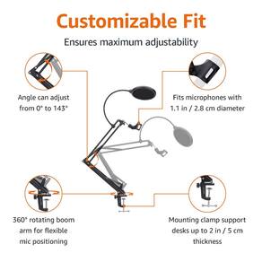 - Suporte de microfone resistente, vem com uma braçadeira de montagem de mesa com uma camada protetora de esponja e parafuso de posicionamento ajustável. Encaixa-se facilmente em qualquer desktop de até 2 polegadas de espessura