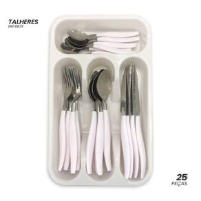 Kit De Talheres Em Inox 25 Peças - Branco Kit de Talheres em Inox com 25 Peças - Branco Com um design sofisticado, esse conjunto de talheres será uma peça fundamental para servir seus convidados com elegância, em sua casa ou mesmo em seu restaurante. Adicionando mais beleza á sua cozinha, se adaptando em diversas ocasiões, seja na hora de fazer um churrasco com a família e os amigos, ou até mesmo para tomar aquele chá da tarde, desde o momento mais formal até o mais descontraído do seu dia. Contando com um porta talher, ajudando na separação e organização dos talheres. Contando com :-06 Facas para Churrasco;-06 Garfos de Mesa;-06 Colheres de Mesa;-06 Colheres de Chá;-01 Porta Talher. Feitos com material de alta qualidade, garantindo leveza e durabilidade, esse jogo de talheres será um verdadeiro diferencial na sua cozinha. - Lavar com sabão neutro e pano ou esponja macia, para uma maior durabilidade do produto;- Não levar ao fogo ou microondas;- Nunca use esponja de aço comum para limpar inox, ela arranha as partes polidas e deixa minúsculas partículas que podem vir a provocar manchas. ESPECIFICAÇÕES:Material: Polipropileno e Aço InoxDimensões:-Garfo: Comprimento: 20cm x Larg. 2,5cm-Faca : Comprimento: 22cm x Larg. 1,5cm-Colher de Mesa: Comprimento: 19,5cm x Larg. 4cm-Colher de chá: Comprimento: 15cm x Larg. 3cm-Porta Talher :Comprimento: 32,8cm x Larg.: 19,8cmPeso:-Garfo: Aprox. 20g.-Colher de Mesa: Aprox. 30g.-Faca : Aprox. 20g.-Colher de Chá: Aprox. 15g.-Porta Talher: Aprox. 100g. Cor: Branco CONTÉM:01 KIT DE TALHERES EM INOX COM 25 PEÇAS - BRANCO
