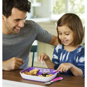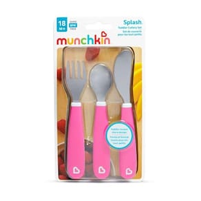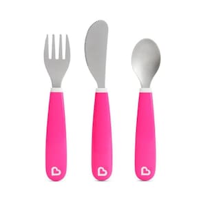 Kit de Talheres em Inox Rosa - Munchkin Kit de Talheres em Inox Rosa - Munchkin O kit de Talheres em inox da Munchkin possui designer ergonômico que facilita a manipulação pela própria criança. A faca possui borda segura, e o garfo conta com pontas arredondadas para maior segurança e independência às crianças. muito prático pois pode ser colocado na parte superior da lava louças.