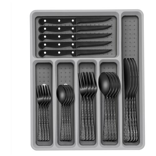 Desfrute de elegância e praticidade com o conjunto de talheres preto de 49 peças da EWFEN. Este conjunto inclui 8 garfos de jantar, 8 garfos de salada, 8 facas de jantar, 8 colheres de jantar, 8 colheres de chá, 8 facas de steak e um organizador de talheres com 6 compartimentos. Ideal para restaurantes, casamentos, eventos, festas, reuniões familiares, catering sofisticado e jantares em casa. Com um design confortável, acabamento polido e resistente à ferrugem, este conjunto é feito de aço inoxidável de alta qualidade, garantindo durabilidade e resistência.