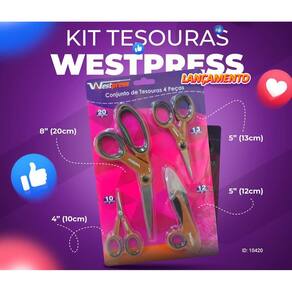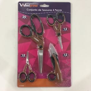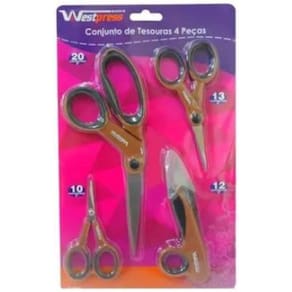 Kit de tesouras corte e costura 4 peças westpress Conjunto com 4 tesouras, indicada para cortar tecidos. Desenvolvida com alto padrão de qualidade, permitindo excelente desempenho, precisão e maciez no corte.