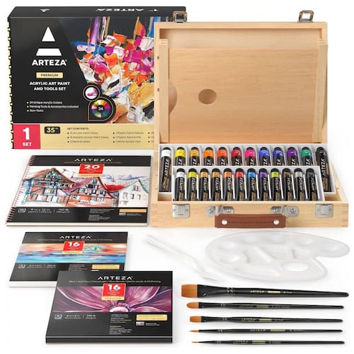O conjunto completo de pintura acrílica projetamos este conjunto de acrílico para que os artistas tenham tudo o que precisam para começar a criar. Este conjunto de pintura acrílica inclui uma caixa de arte e ferramentas de arte, como pincéis, uma paleta de pintura e faca e 24 tintas. Dê o presente da arte nosso kit de pintura foi criado para o aspirante a artista visual em sua vida. Está incluído tudo o que eles precisam para começar a explorar seu ofício. Este conjunto também vem com tintas metálicas altamente pigmentadas e uma almofada de acrílico preta. Livre de toxinas e produtos químicos nocivos garantimos que todos os nossos materiais de arte estejam livres de substâncias nocivas e que sejam s para artistas de todos os níveis. Criado por Arteza Artists Aqui na Arteza, somos apaixonados por criar produtos que inspiram. Para nós, a arte é uma expressão da experiência humana. É por isso que trabalhamos para tornar nossos materiais de arte acessíveis a todas as pessoas Marca: Não Informado