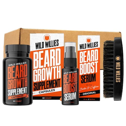 - Wild Willies Kit de crescimento da barba: vamos direto ao assunto — este é o kit que você precisa para o crescimento da barba. Inclui sérum para crescimento de barba, suplemento de crescimento de barba, escova de cerdas de javali e bolsa de viagem.
