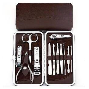 - Kit de unha com 12 peças: 1 cortador de unha grande, 1 cortador de unha médio, 1 cortador de unha pequeno, 1 alicate, 1 lixa, 1 pinça, 1 palito, 2 utensílios de desencravar unha, 1 tesourinha