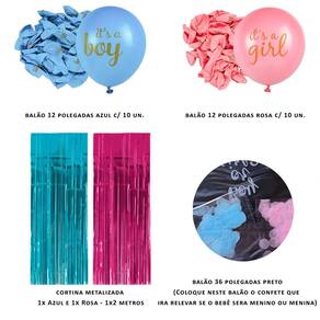 - Kit completo e pronto para usar; - Ideal para revelar o sexo do bebê de forma emocionante e divertida; - Cores vibrantes e decoração que encanta nas fotos; - Fácil de montar e combina com qualquer ambiente; - Balão preto gigante perfeito para o momento da revelação.
