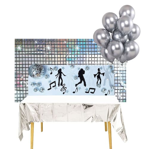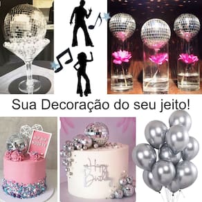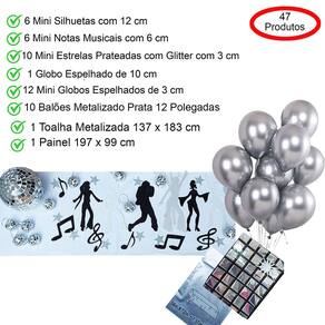 Kit Decoração Festa Disco Anos 80: Cortina Metalizada + Painel + Mini Globos + Balões + Enfeites = 47 Produtos Temáticos. Surpreenda seus convidados com uma decoração temática Discoteca Anos 80. Perfeito para decorar o ambiente, a mesa e até o bolo, solte sua criatividade e arrase na decoração. Kit contendo: 1 Painel decorativo Prateado Brilhante. Tamanho: 197 cm de comprimento x 99 cm de altura. 1 Toalha de mesa Prateada retangular. Tamanho: 137 x 183 cm. 1 Globo de 10 cm. 12 Mini Globos 3 cm. 10 Balões Metalizados Prata de 12 polegadas. 6 Mini Silhueta dançarinos com glitter nas cores preto e branco, podendo variar em colorido. Confeccionado em EVA. Tamanho aproximado de 12 cm. 6 Mini Notas Musicais com glitter, cores podendo variar entre preto, branco ou colorido. Confeccionado em EVA. Tamanho aproximado de 6 cm. 10 Mini Estrelas prateadas com glitter, podendo variar em preto ou colorido. Confeccionado em EVA. Tamanho aproximado de 3 cm. Total de 47 produtos temáticos. Atenção: Produto de alto giro, recebemos novas remessas semanalmente e algum detalhe pode variar conforme o lote recebido, porém o produto é o mesmo e mantém as mesmas características e qualidade. Contém: 1 Painel Decorativo + 1 Toalha de Mesa + 1 Globo 10 cm + 12 Mini Globos 3 cm + 10 Balões Prata + 6 Mini Silhuetas Dançarinos + 6 Mini Notas Musicais + 10 Mini Estrelas = Total de 47 produtos temáticos. Fotos ilustrativas e reais do produto. Marca: Party Time