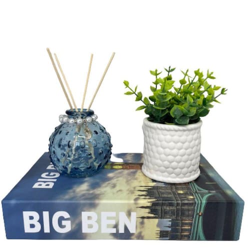 Kit decoração livro de papelão estampa 'Big Ben', vaso branco de cerâmica trabalhado e difusor azul de vidro trabalhado.