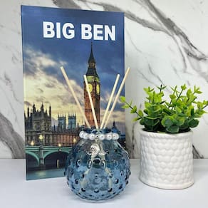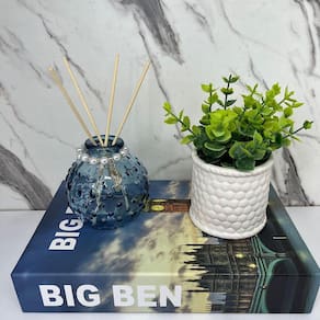 Nada mais encantador, original e inspirador do que utilizar livros na decoração de diversos ambientes, como salas de estar, escritórios, quartos, home office e onde mais sua imaginação permitir. Os livros decorativos são a mais nova tendência na decoração contemporânea e permitem diversas combinações e utilizações, dando um ar de sofisticação em mesas de centro, aparadores, prateleiras, escrivaninhas etc. Esse lindo livro estampa 'Big Ben', irá encantar você pela riqueza de detalhes e qualidade no acabamento, junto do vaso branco de cerâmica trabalhado e difusor azul de vidro que dão um toque todo especial no ambiente.