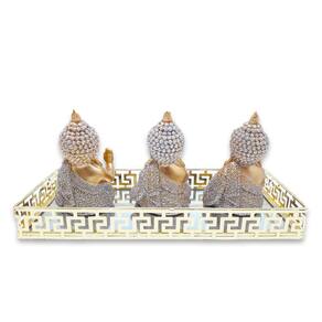 Enfeite composto de 3 Buda tailandês cada um com 10 cm de altura e uma bandeja espelhada.