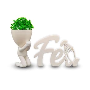 Kit Decoração Planta Artificial + Vasinho Orando + Fé 3d - cor branco