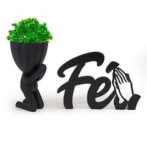 Kit Decoração Planta Artificial + Vasinho Orando + Fé 3d - cor preto