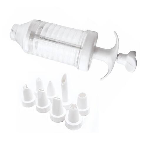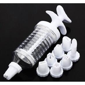 Com a ferramenta de aplicação seringa para confeitar e decorar seus bolos e cupcakes nunca foi tão fácil. Recheie pães de queijo e muito mais. Faça biscoitos e vários tipos de quitutes com facilidade. Uma divertida ferramenta indispensável para personalizar e embelezar suas sobremesas favoritas. Funciona como uma seringa, esta ferramenta de aplicação é fabricada em plástico rígido de qualidade, transparente e com 8 opções de bicos, inclusive para rechear. Especificações: fácil de limpar material: plástico medidas aproximadas: 18 cm compr. X 4,5 cm diâmetro peso total aproximado: 60 gramas
