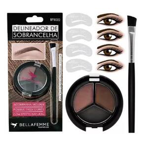 O Kit Delineador de Sobrancelhas da Bella Femme é composto por: 1 trio de sombras para sobrancelhas, 1 pincel, 3 moldes de sobrancelha e 1 guia prático. Preenche a sobrancelha deixando com um efeito natural. Informação adicional: