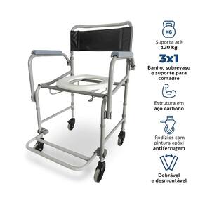 Cadeira de Banho D40: 3 em 1: banho, suporte sobre vaso e uso com comadre. Estrutura em aço carbono com pintura epóxi resistente. Dobrável e desmontável. Apoios ergonômicos e encosto em corino. Rodízios 360° para mobilidade total. Suporta até 120 kg. Medidas: 93x60,5x59 cm | Peso líquido 6,15 kg | Embalada 52x18x45 cm | Peso bruto 7 kg