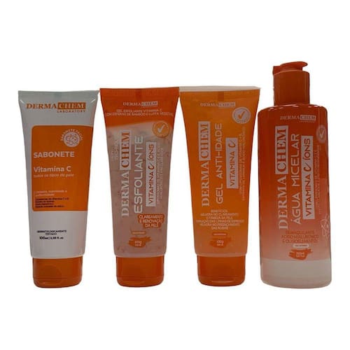 Kit Dermachem Vitamina C 4 produtos Kit DermaChem Vitamina C 01-Sabonete liquido facial 01-gel esfoliante 01-gel anti idade 01-água micelar O Gel Esfoliante Facial DermaChem Vitamina C foi desenvolvido com compostos naturais provenientes do Bamboo e da Bucha Vegetal. A associação dos Lipossomas de Vitamina C e E com suas propriedades clareadoras associado ao Ácido Hialurônico deixam a pele com sensação hidratada e revitalizada pós esfoliação. A Água Micelar Dermachem Vitamina C com Íons é formulada com uma tecnologia inovadora de ativos que auxiliam na limpeza da pele, tonificação, efeito demaquilante e associado ao Ácido Hialurônico, Lipossomas de Vitamina C e E ativos com alta capacidade de permeação. Também utiliza ÍONS, que dão o toque final ao produto, preenchendo imperfeições com propriedades incríveis. O Sabonete Líquido Facial Dermachem Vitamina C com Íons possui tenso ativos suaves que não agridem a pele, deixando toque macio e sedoso. Também conta com Lipossomas de Vitamina C e E, que associado ao Ácido Hialurônico auxiliam na revigoração da pele com sedosidade.