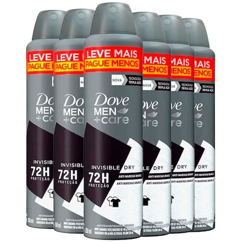 Dê um basta às manchas brancas em suas roupas com o Antitranspirante Dove Men+Care Aerosol Invisible Dry. Testado em mais de 100 cores, esse poderoso aerosol seca instantaneamente sem deixar resíduos, mantendo suas roupas livre de manchas. Sem água ou álcool, o aerosol seco de Dove não deixa sua pele com uma sensação molhada. Esse desodorante aerosol masculino proporciona uma poderosa proteção de 48 horas contra o suor e o mau cheiro. Além disso, sua exclusiva tecnologia com ¼ de creme hidratante foi feita também para manter sua pele livre da irritação. Mantenha-se seco e evite manchas brancas com o Antitranspirante Dove Men+Care Aerosol Invisible Dry. Disponível em roll-on e aerossol, Dove Men+Care tem o que você precisa para se sentir sempre seguro e com uma agradável sensação de frescor que dura o dia inteiro. Dove Men+Care celebra uma nova definição de força masculina, em que o cuidado com o bem-estar do seu corpo é o centro de tudo. É por isso que Dove oferece a você uma linha completa de produtos, de antitranspirantes a tratamentos para os cabelos, desenvolvida com poderosos ingredientes pensados em cada uma das suas necessidades. O resultado é proteção e cuidado completos e duradouros. Experimente os desodorantes, sabonetes, shampoos, condicionadores e cremes para pentear de Dove Men+Care e conheça um novo jeito de se cuidar. Dove Men+Care celebra uma nova definição de força masculina, em que o cuidado com o bem-estar do seu corpo é o centro de tudo.