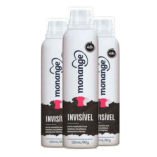 O Desodorante Aerosol Monange Invisível proporciona uma pele seca por muito mais tempo, sem causar irritações. Pode ser utilizado por todos os tipos de pele pois seus agentes hidratantes ajudam a manter a pele macia e livre de irritações. Além de deixar um perfume suave durante todo o dia. O Desodorante Aerosol Monange Invisível reduz a quantidade de resíduos nas roupas pretas, brancas ou coloridas, ao mesmo tempo em que oferece hidratação e proteção intensa para as axilas.