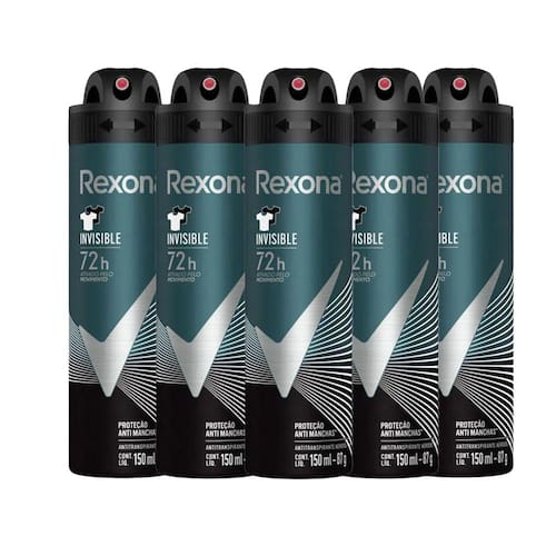 - Kit Desodorante Aerosol Rexona Invisible Men 150ml - 5 Unidades - Nada é melhor contra manchas e transpiração ; - Não contém álcool etílico; - Exclusiva Tecnologia MotionSense: proteção para te manter em movimento; - 72 horas de proteção contra o odor e a transpiração; - Testado dermatologicamente. Ean: 000000000017
