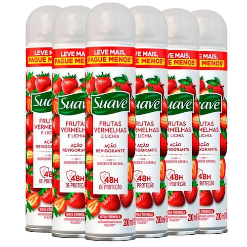 O Desodorante Aerosol Suave Frutas Vermelhas possui ação antitranspirante garantindo 48 horas de proteção contra o mau odor causado por bactérias e sensação de banho fresco. Proporciona proteção duradoura e eficaz para a pele, age controlando a transpiração excessiva da pele, mantendo até 48 horas de proteção com máxima discrição, não mancha as roupas e ainda auxilia na hidratação da pele. Além disso, o Desodorante Aerosol Suave Frutas Vermelhas contém uma suave fragrância de frutas vermelhas e lichia, que proporciona uma sensação de bem estar e refrescância por muito mais tempo.