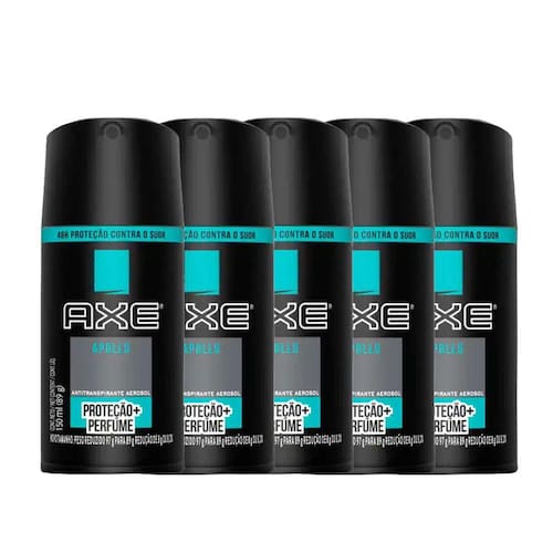O Kit Desodorante Antitranspirante Aerosol Axe Apollo 150ml - 5 Unidades foi desenvolvido para novos homens que possui uma vida agitada, com isso a axe criou uma mistura entre sálvia com frutas cítricas e de flores com tons amadeiradas, tudo para uma fragrância viciante entre o frescor e o quente.