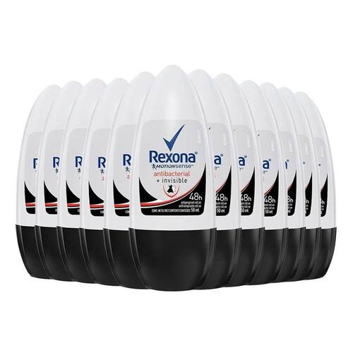 Kit Desodorante Roll On Rexona Feminino Antibacterial Invisible 50ml - 12 Unidades