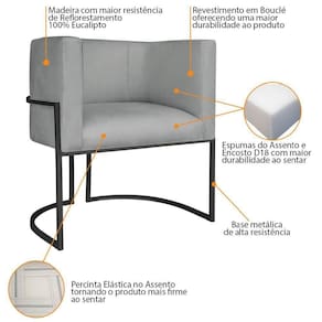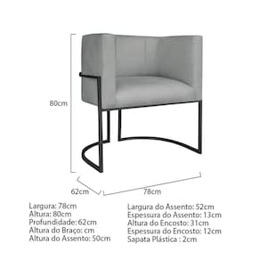 Especificações Técnicas da Poltrona Luna Base de Ferro: - Altura: 80 cm; - Largura: 78 cm; - Profundidade: 62 cm; - Altura do Assento: 50 cm; - Largura do Assento: 52 cm; - Altura do Encosto: 31 cm; - Espessura do Assento: 13 cm; - Espessura do Encosto: 12 cm; - Peso Suportado: 120 kg.