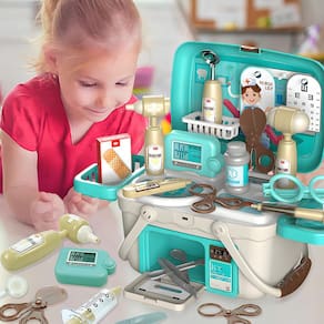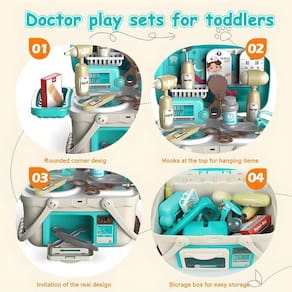 - 👶 Design adequado para crianças — Nosso conjunto médico de brinquedo para crianças atende aos requisitos de segurança da ASTM. Design com bordas lisas e arredondadas, sem pontas ou cantos afiados, o que é seguro para as crianças brincarem. Este kit médico falso para meninas é feito de plástico ecológico e seguro para crianças, é fácil de limpar para a máxima higiene.