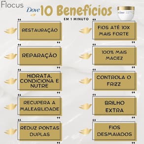 Este creme de reconstrução garante hidratação e nutrição profundas, para cabelo até 10x mais forte, 100% mais macio e com extra brilho. O creme de tratamento Dove Bond Intense Repair repara danos térmicos e químicos, controla o frizz e reduz pontas duplas. Indicação: