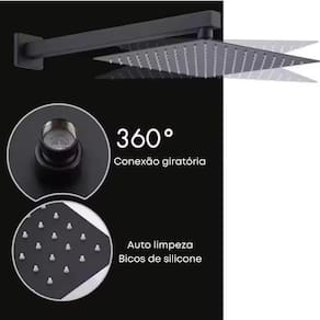 Ducha articulável em metal medindo 20X20 e braço de chuveiro quadrado Acabamento cromado de alta durabilidade, resistência e livre de ferrugem; Dutos de saída de água em silicone Base do chuveiro com pré filtro: impede o acúmulo de sujeiras que possam vir a obstruir a saída de água; Bitola de instalação: 1/2'; Pressão mínima para funcionamento: 4 mca; Pressão máxima de funcionamento: 40 mca; Suporta altas temperaturas, de até 70°C