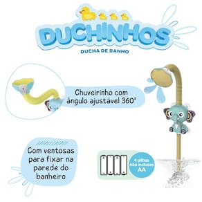 Comprando neste anúncio, você garante um mimo especial para tornar a hora do banho ainda mais divertida: um kit super fofo com bichinhos de borracha que fazem barulho ao apertar Ideal para entreter, estimular os sentidos e transformar o banho em um momento de alegria para os pequenos. Agora, falando da estrela do show... A Duchinha de Banho Infantil - Elefantinho foi pensada para deixar o banho mais prático, seguro e cheio de diversão Seu design lúdico com carinha de elefante encanta os pequenos e ajuda os papais e mamães na hora de lavar com carinho. Com chuveirinho de ângulo ajustável em 360, essa duchinha é super versátil e fácil de manusear. Ela possui ventosas para fixação segura na parede do banheiro e um sistema de bombeamento eficiente e protegido, garantindo tranquilidade durante o uso. Além disso, funciona com 4 pilhas AAA não inclusas , facilitando o uso mesmo fora do chuveiro, em banheiras ou piscinas infláveis, por exemplo. Ideal para bebês a partir dos 4 meses, essa duchinha é um verdadeiro aliado para tornar o banho um momento de conexão e alegria. Dimensões aproximadas: 67 x 10 x 5 cm Utiliza 4 pilhas AAA não inclusas Indicação: a partir de 4 meses Sobre o mimo especial incluso: Kit com bichinhos que fazem barulho ao serem apertados, produzidos em plástico seguro, livre de BPA e ftalatos. Acompanha uma mini banheirinha para guardar e brincar com os bichinhos durante o banho. Um toque extra de fofura e diversão que vai conquistar os pequenos Marca: Não Informado