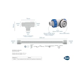 • 1 Mangueira com rosca de 3/4". 1 Válvula com rosca 3/4" e 1.1/2". 1 "T" com rosca 3/4". 1 Válvula Redutora de Pressão com Manômetro Integrado
