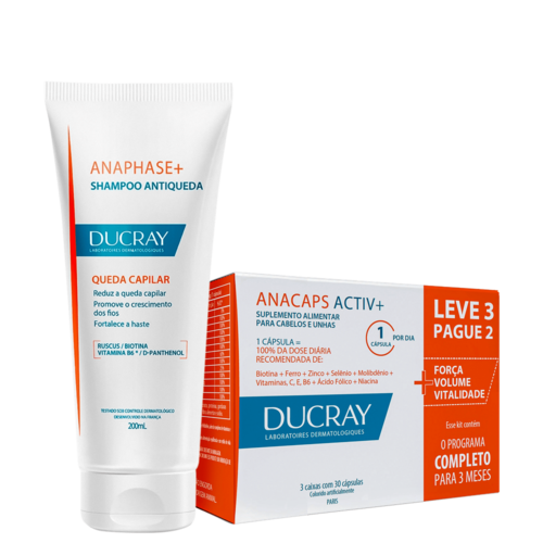 Kit com shampoo dermatológico antiqueda para fios minguados, além de suplemento vitamínico. DUCRAY Anacaps + Anaphase confere todos os nutrientes essenciais para diminuir a queda fortalecer as fibras capilares.