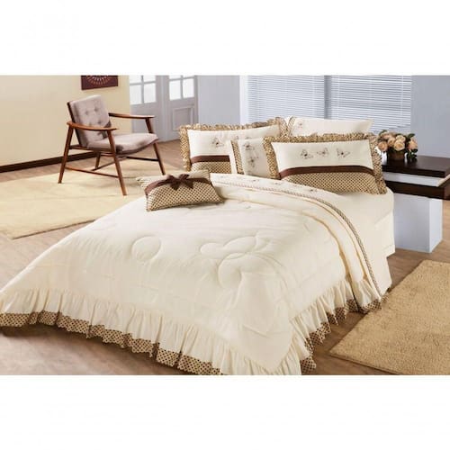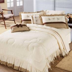 O Edredom Naturale possui detalhe com babado estampado em poa, matelado no formato de borboletas, acompanha dois porta travesseiros com babado e bordados delicados e para compor o Kit, uma linda almofada com um lindo laço.