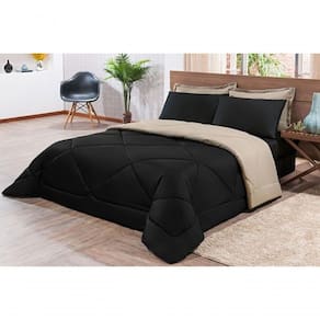 Kit Edredom + Jogo De Lençol Aconchego Look House Dupla Face Casal King 06 Peças - Preto E Caqui O Kit Look House, traz para seu ambiente um conjunto de roupas de cama com todas as peças que você precisa para deixar seu ambiente aconchegante, sem contar o conforto para as noites de sono. Produto composto por: 01 Edredom 2,80m x 2,50m 01 Lençol de baixo c/ elástico para colchão de 1,98m x 2,03m x 0,30cm 02 Porta travesseiros 70cm x 50cm 02 Fronhas de 70cm x 50cm Composição tecido: 80% Algodão / 20% Poliéster Marca: Enxovais Davy | Estampa: Não se Aplica | Medidas: 01 Edredom 2,80m x 2,50m01 Lençol de baixo c/ elástico para colchão de 1,98m x 2,03m x 0,30cm02 Porta travesseiros 70cm x 50cm02 Fronhas de 70cm x 50cm | Número de Peças: 06 Peças | Material: Poliéster | Cor Predominante: Preto E Caqui | Cama Indicada: King