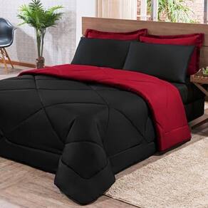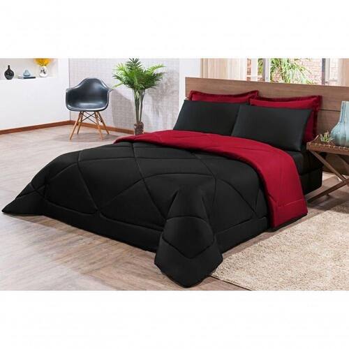 Kit Edredom + Jogo De Lençol Aconchego Look House Dupla Face Casal King 06 Peças - Preto E Vermelho O Kit Look House, traz para seu ambiente um conjunto de roupas de cama com todas as peças que você precisa para deixar seu ambiente aconchegante, sem contar o conforto para as noites de sono. Produto composto por:01 Edredom 2,80m x 2,50m01 Lençol de baixo c/ elástico para colchão de 1,98m x 2,03m x 0,30cm02 Porta travesseiros 70cm x 50cm02 Fronhas de 70cm x 50cm Composição tecido: 80% Algodão / 20% Poliéster