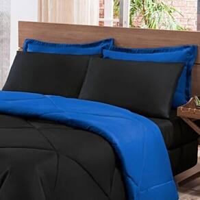 Kit Edredom + Jogo De Lençol Aconchego Look House Dupla Face Casal Queen 06 Peças - Preto/ Azul